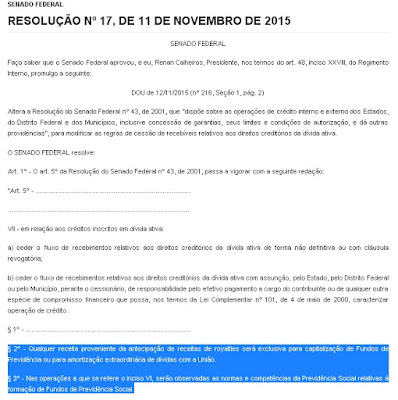 Para que achava que as receitas das antecipações dos royalties seria uma farra, acabou, A nova resolução do dia 11 de novembro determina que: ” § 2º – Qualquer receita proveniente da antecipação de receitas de royalties ou da antecipação do fluxo de recebimentos dos créditos inscritos em dívida ativa será exclusiva para capitalização de Fundos de Previdência ou para amortização extraordinária de dívidas com a União”.