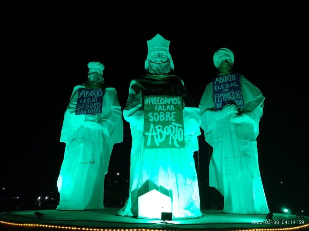 Manifestantes colocam cartazes em imagens de Reis Magos e picham outdoor em proptesto pró-aborto.