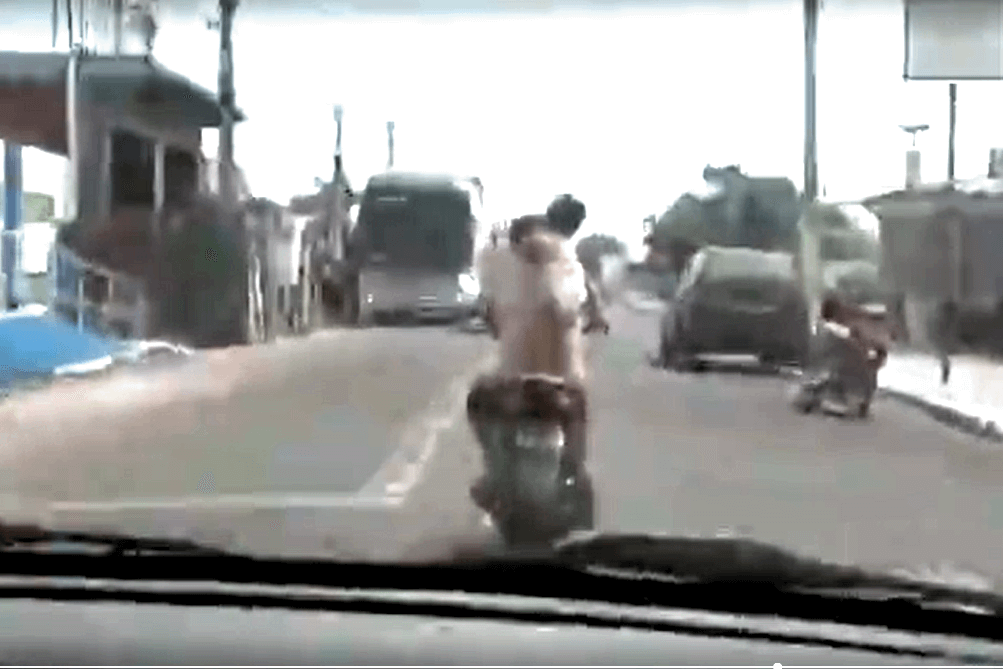 Vídeo flagra homem trafegando com criança em pé e sem capacete na garupa de moto
