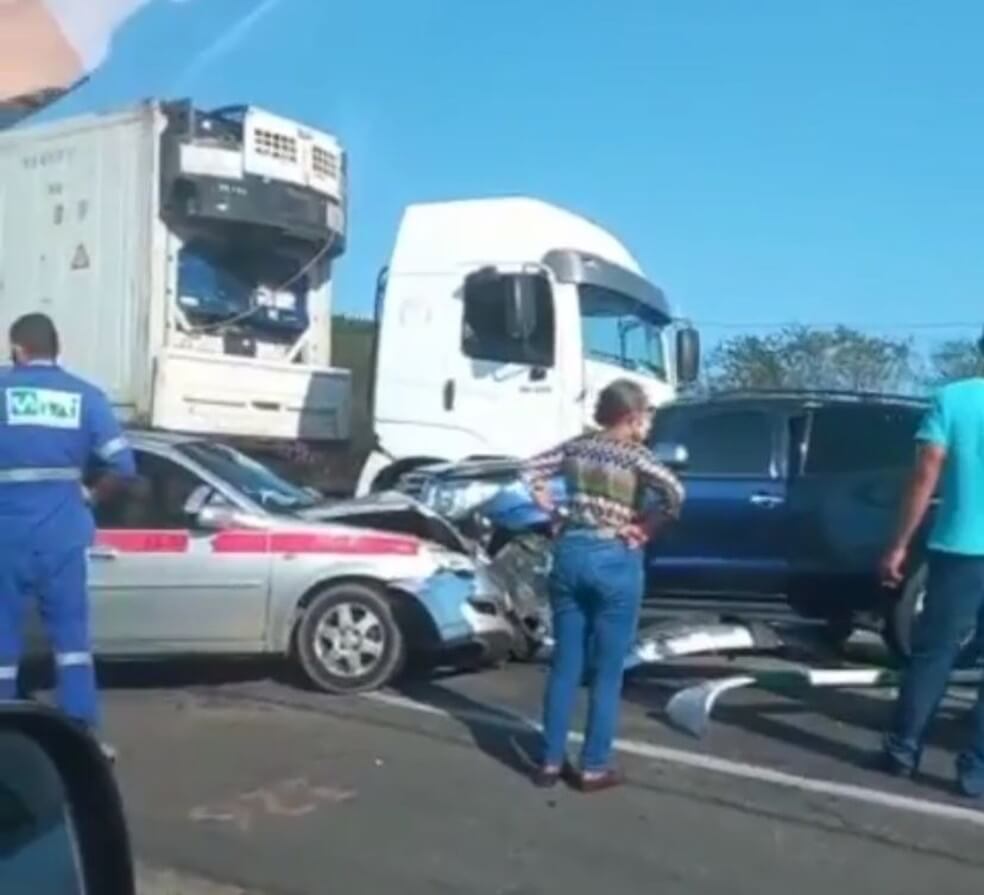 BR-304 fica interditada após acidente entre caminhão, ônibus e dois carros na tarde desta sexta-feira (17)