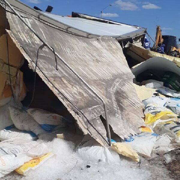 Guamaré: Caminhão carregado de gelo tomba em curva na RN-401